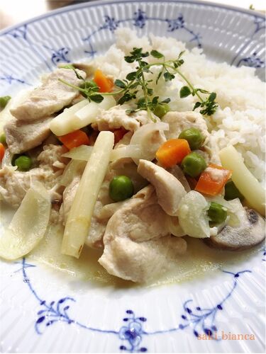 Hühnerfrikassee mit Reis (鶏のフリカッセ、ライス添え)これもドイツのレストラン、学食、社員食堂等での定番料理です。 本当は粘りの少ないインディカ米を添えるのですが、今回は粘りの少ない大はずれだった日本米で代用しました フライパン一つでできる鶏…