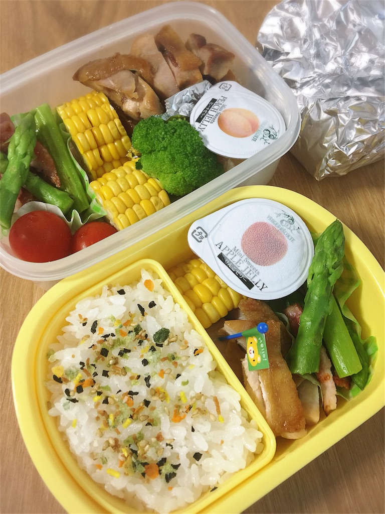 今日のお弁当は、鶏の照り焼き、アスパラガスとベーコン炒め、朝採れコーン、冷凍フルーツゼリー、野菜ふりかけご飯にしました。